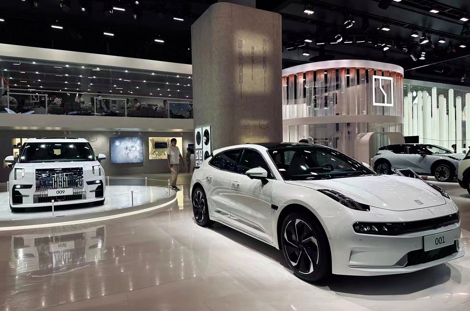 科技與藝術的完美融合:極氪展臺將科技與藝術元素巧妙結合,創造出一個既充滿科技感又不失藝術氛圍的展示空間。這種設計不僅展示了極氪品牌的前沿科技實力,還通過藝術手段增強了品牌與用戶的互動和共鳴。