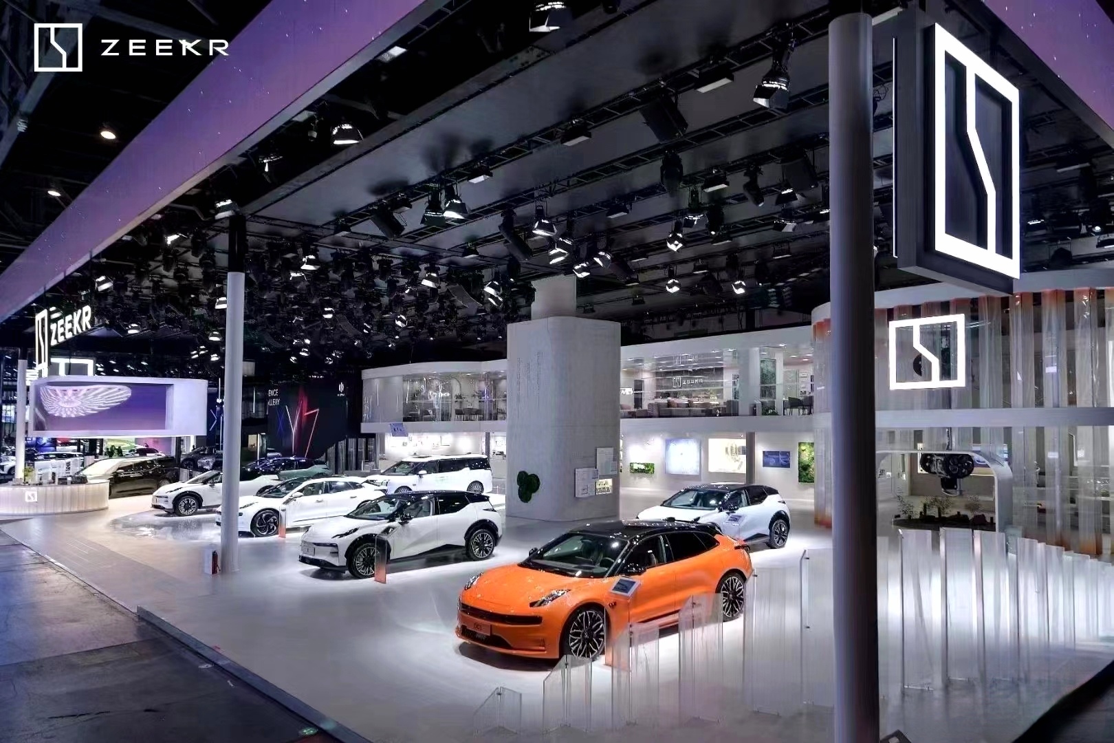 開放性布局:極氪展臺采用開放性布局和簡約的設計,打破了空間的沉悶感,增強了視野通透感。這種設計讓觀眾能夠更加自由地瀏覽和欣賞展品,同時也提升了展臺的整體美感和舒適度。