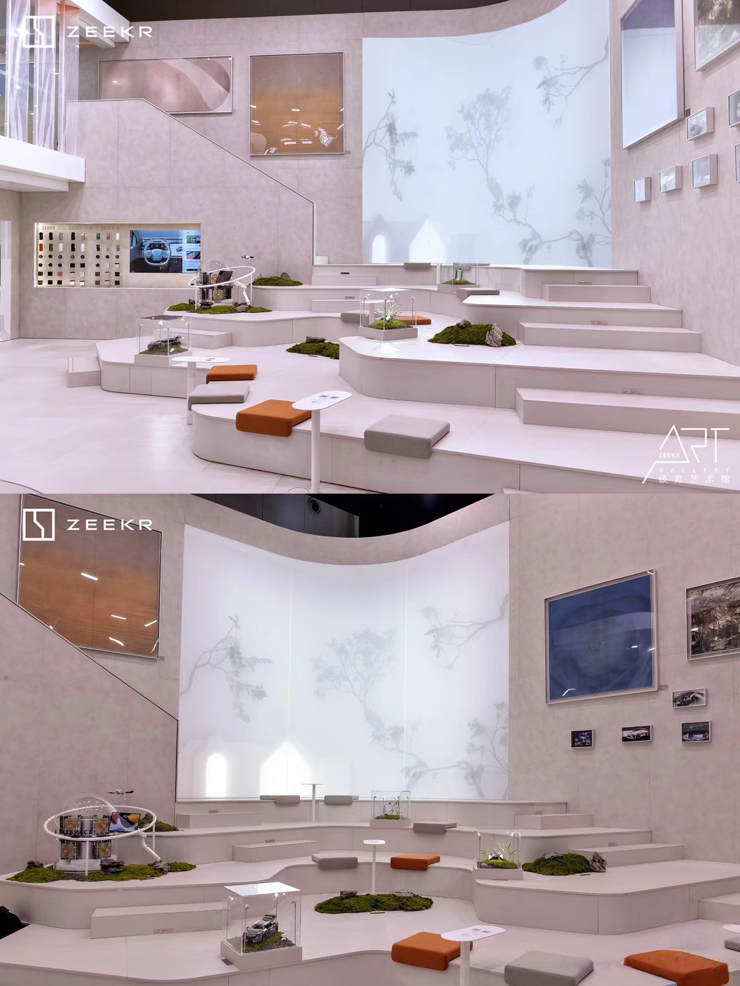 跨界合作藝術館式展臺:極氪展臺與松美術館共同設計,延續了“藝術館”的風格,將科技與藝術完美融合,共同打造出一個充滿藝術氣息的科技空間。這種跨界合作不僅提升了展臺的藝術價值,還拓寬了品牌的文化內涵,為觀眾帶來獨特的視覺享受和沉浸式體驗。這種設計不僅展現了極氪品牌的先鋒創新之美,還通過藝術手段增強了品牌與用戶的互動和共鳴。