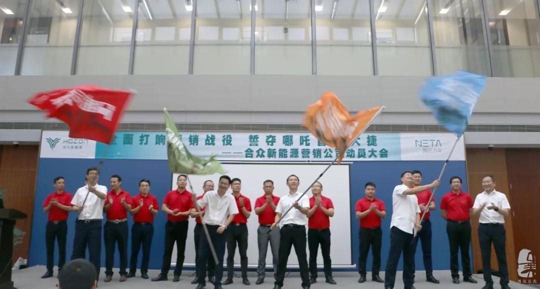 當天的動員大會上,合眾新能源副總裁兼營銷公司總裁黃招根宣布,成立東部、南部、中部以及北部四大營銷戰區,并對相關人員進行任命以及授旗儀式。黃招根表示,要以使命必達的信念,敢拼能贏的信心,與“哪吒”一起鬧海,打贏接下來的營銷戰役。