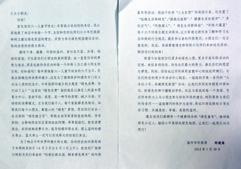 在“綠滿家園”賀卡寄出不久后,隊長學校紛紛收到了領導回信,對孩子們在少年兒童小小年級就能夠樹立建設綠色校園的理念,并努力參與綠色校園建設活動,感到由衷的欣慰和感動。其中市環保局局長鄭建海在給隊長學校王點同學的回信中希望大家都能擁有一個健康快樂的“綠色童年”,能繼續做綠色小達人,描繪心中美麗的綠色地圖。市郵政局局長孟一兵在給鄭熠辰同學的回信中提到溫州郵政局將接牢你傳遞來的“綠色接力棒”,加入到“綠滿溫州”大軍中來,為營造更加整潔優美、文明健康、和諧有序的生產生活環境盡一份力,讓綠色真正“綠滿溫州”。