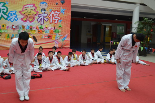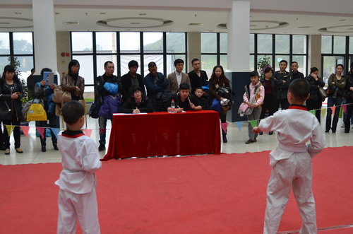 2012年3月17日上午, 40余名學員在中心一樓大廳參加跆拳道等級考試。他們分別根據自己的水平報考黃帶、黃綠帶、綠帶等級別。 學員們在中心老師的帶領下通過一系列的熱身運動后,發揮出色,現場的家長更是在場外為努力拼搏奮斗的孩子們吶喊助威。通過本次考級,學員們了解了自己學習中的不足,活動策劃,更知道在今后的訓練中如何達到規范要求。本次考級采用全國跆協統一考級標準,通過者可發放國家跆協統一證書。