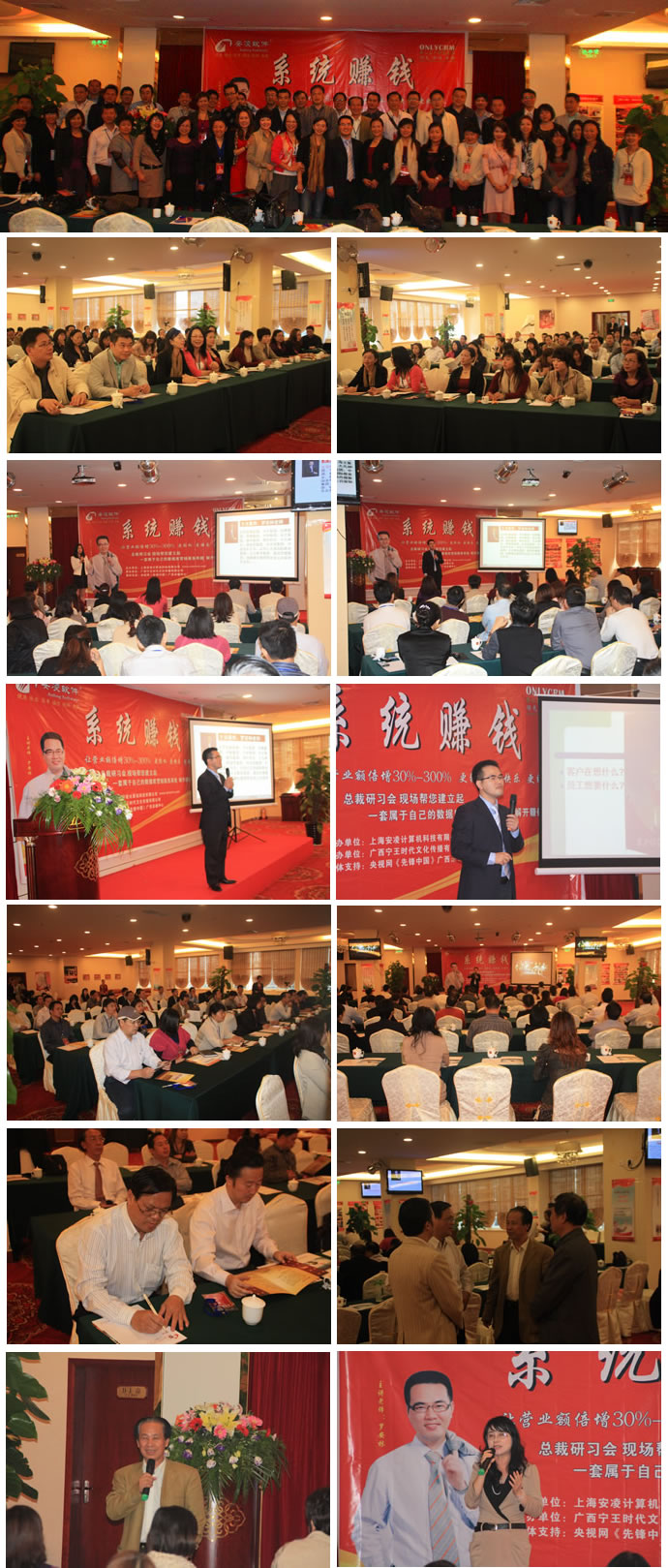 2011年10月28日安凌軟件攜手南寧寧王文化傳播有限公司在南寧召開“系統賺錢”研習會,旨在將一種新型的營銷管理模式傳播分享給南寧智慧的企業家們,此次研習會規格高,得到了南寧各界人士的鼎力支持,招商局、工商聯、商會組織相關負責人紛紛帶領一批最具學習力的企業家朋友參與其中,期待通過這次研習會的學習,在企業內打造出高績效的營銷管理平臺和管理團隊!