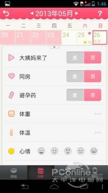 對女性用戶而言,使用這樣一款APP可準確記錄和推算月經周期,并獲得較為全面、詳盡的小貼士,以解決各類生理難題。它提供了日歷功能,安全期、月經期、危險期一目了然,此外,用戶還可以錄入其他更詳細的信息,例如是否同房、是否吃避孕藥、體重、體溫、心情等等,便于全面記錄用戶的身體狀況,以建立詳細的個人檔案。