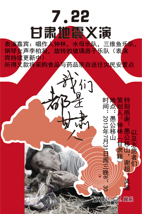 由甘肅天水籍音樂人鐘林發起組織的“我們都是甘肅人”主題賑災義演,將于7月31日在北京“愚公移山LIVE HOUSE”舉行,當晚,除了鐘林獻唱外,還將有五組藝人為本次義演登臺獻藝,他們分別是三維魚樂隊,,水母樂隊,“民謠女聲” 談麗君(甘肅天水籍),“鋼琴女聲”李柏凝,旋轉的玻璃房子樂隊。用鐘林的話來說,這將是一場充滿“文藝范兒”的義演,據悉,本次義演的全部收入,將用來采購急需物資,由專人負責送往災區安置點,為在此次地震中受災的人們,盡一點綿薄之力。