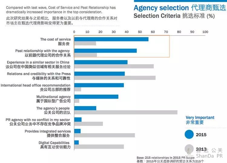 “57%的營(yíng)銷人員將服務(wù)費(fèi)作為甄選的首要因素,該比例2013年僅為13%,”R3公司執(zhí)行董事Sabrina Lee介紹:“單憑這一點(diǎn),我們就可以估計(jì)到中國(guó)公關(guān)業(yè)將要面臨新的挑戰(zhàn)與面貌。”
