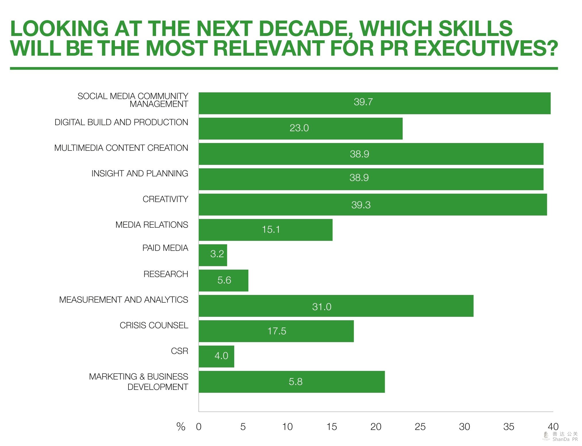 從區(qū)域細(xì)分來(lái)看,在美國(guó),42%的公關(guān)公司認(rèn)為多媒體內(nèi)容創(chuàng)作能力最為重要;然而,亞太地區(qū)的公關(guān)公司則更看重策劃整合能力(49%),其次是創(chuàng)意能力(28%)。
