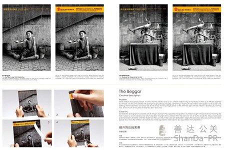 創(chuàng)意表現(xiàn):運(yùn)用真實(shí)的控線與紀(jì)實(shí)畫面結(jié)合,形成如同木偶控線般的效果,將“被操控的孩子”這個(gè)核心主題視覺化呈現(xiàn),同時(shí)設(shè)計(jì)一個(gè)可以撕開的封條,(文章來自活動(dòng)策劃公司、上海公關(guān)公司),當(dāng)受眾撕開封條,束縛在孩子身上的真實(shí)控線,就會(huì)斷開落下,呈現(xiàn)解救他們的方法——“救護(hù)兒童會(huì)”。