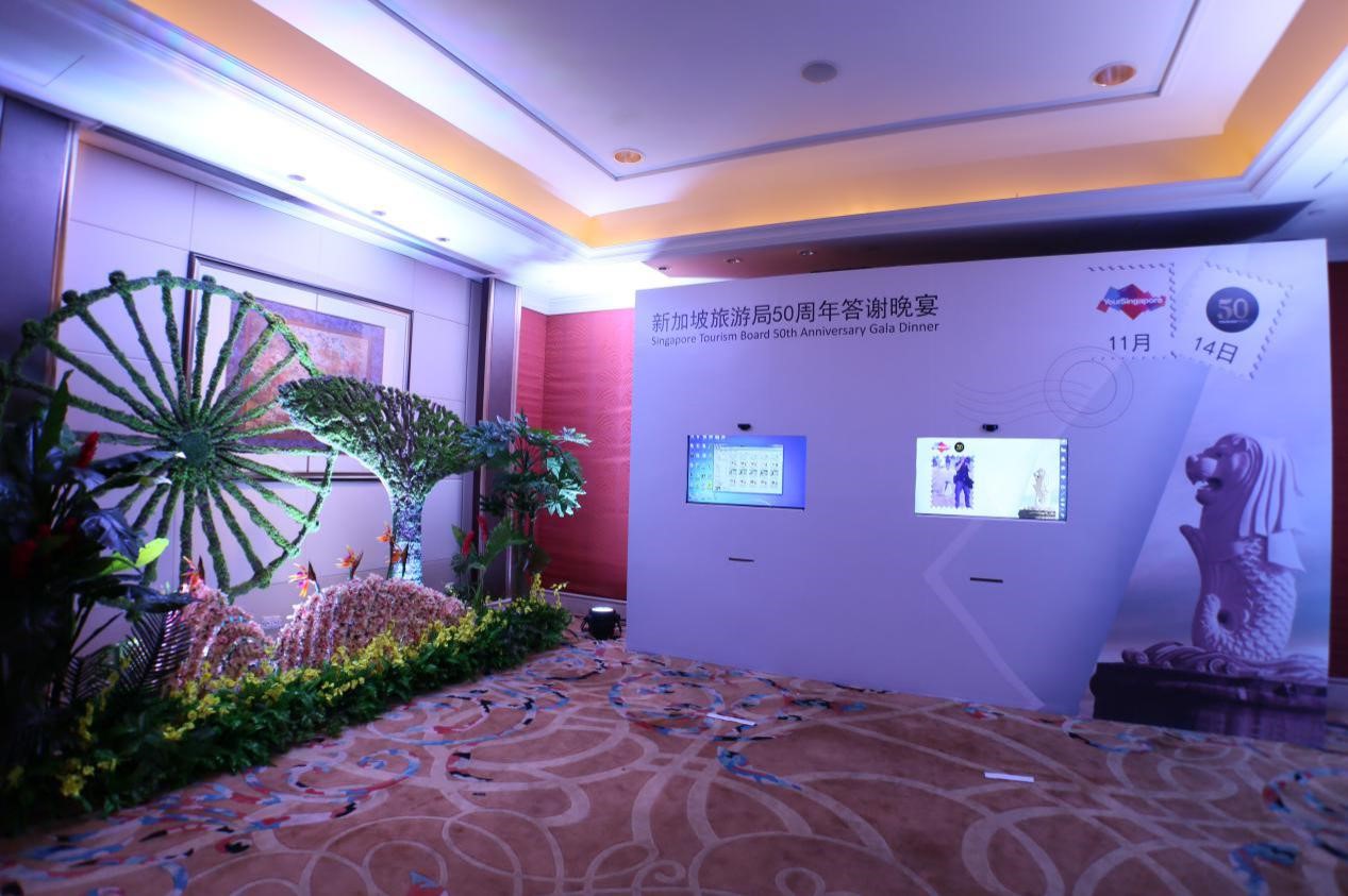 現場采用了電子拍照簽名,來賓拍完照后在觸摸屏上用專用筆簽名,通過原筆記效果的簽名,把傳統文化元素和高新技術進行完美的結合,彰顯主賓尊貴身份的同時也增強了嘉賓的參與感。在布置上圍繞著花園城市的發展歷程,總結性的展示新加坡50年的歷史。這一創新引起現場嘉賓的不斷地拍照通過微博,微信轉發,讓更多的人見證了新加坡旅游局50周年