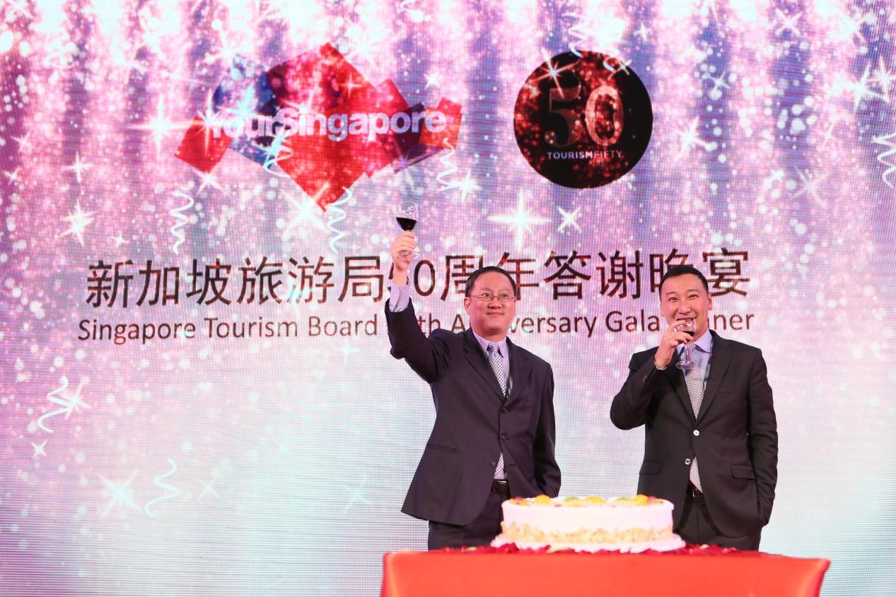 新加坡旅游局大中華區署長周振興和新加坡共和國駐上海總領事館王首毅總領事共同舉起手中的酒杯, 慶祝這個激動人心的時刻。并祝新加坡旅游局在華的業務所向披靡,創造奇跡!
