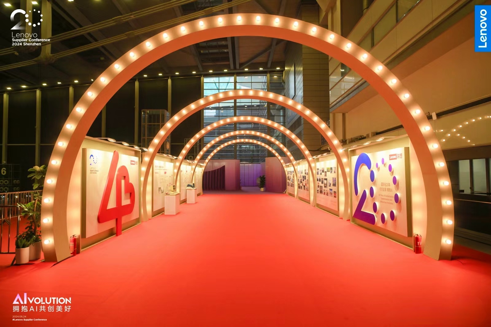2024年聯想集團全球供應商大會的活動現場設計亮點在于其獨特的主題色調、豐富的AI元素、高質感的材質與造型、科技感十足的展示區以及深入的品牌歷程展示,同時前沿技術與產品的亮相也彰顯了聯想集團在科技創新和數字化轉型方面的實力與決心。