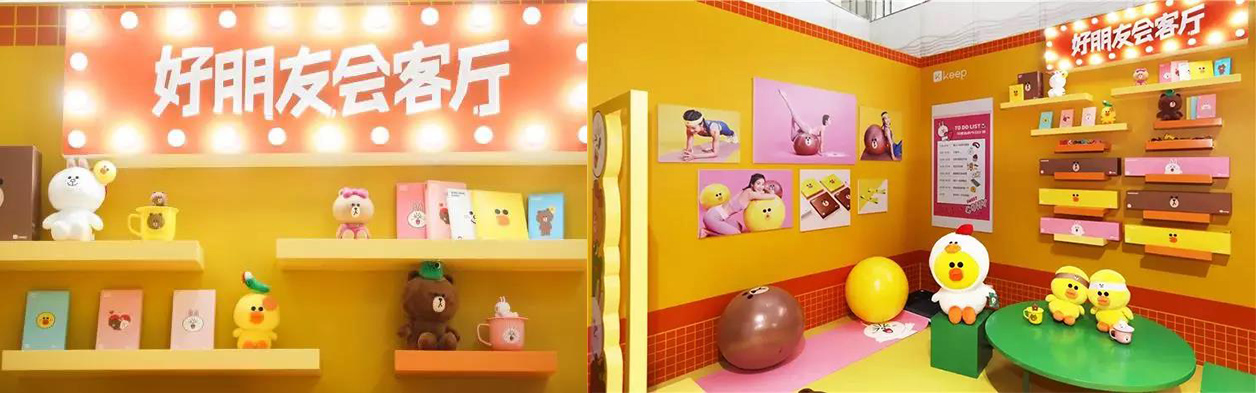 除了互動體驗,Keep還與linefriends合作,推出超萌的周邊產品,開設“好朋友”專柜。玩家可以在這里選購,布朗熊大瑜伽球、可妮兔瑜伽磚等相關產品,同時還可以在這里和linefriends合影。