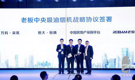 在得到政策支持的同時,中央吸油煙機目前已進入20多個城市,與全國多家品牌房企達成戰略合作,在30多個住宅項目上落地。本次發布會上,老板電器與萬科采筑、恒大恒騰、房協優采平臺就中央吸油煙機簽署戰略合作協議。