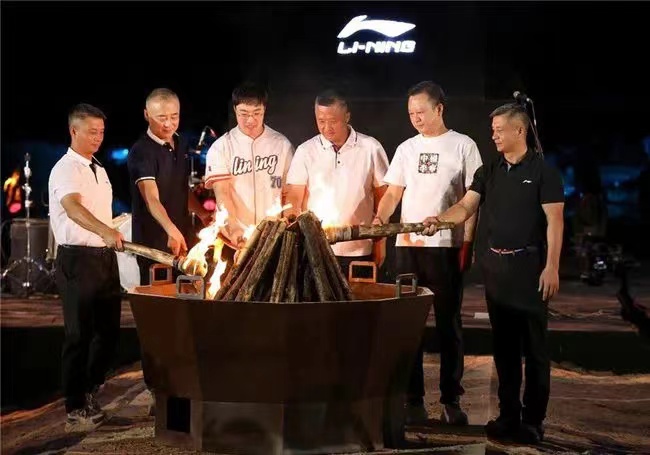 秀場的燈光主要以暖橙色為主,給人營造出一種溫暖的氣氛,在秀場結(jié)束之后,“食肆”開始擺上當(dāng)?shù)靥厣朗撑c美酒,此時(shí)屏幕上展示出李寧公司董事長錄制的簡短的VCR,隨著現(xiàn)場嘉賓共同點(diǎn)燃篝火,演出正式開始。