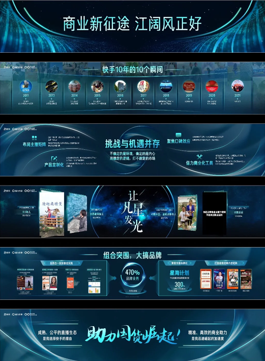 整體設計我們在大會KV的基礎上延展,以藍、綠色為主色調。藍色營造出濃郁的未來感,綠色象征快手不斷成長和發展的狀態,再搭配「起風之勢」,快手的十年征程,躍然屏上。